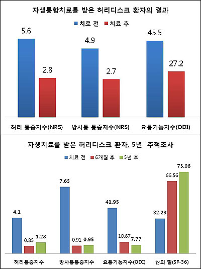 이 결과, 환자들의 허리통증지수(요통NRS)는 5.6에서 2.8로 절반으로 줄어들었으며, 다리가 저리는 방사통(방사통NRS) 역시 4.9에서 2.7로 절반 가까이 떨어졌다. 또한 허리통증으로 일상생활에 지장을 주는지 알아보는 요통기능장애지수(ODI)는 45.5에서 27.2로 줄어들어 일상생활을 하는데 전혀 불편함이 없었다.