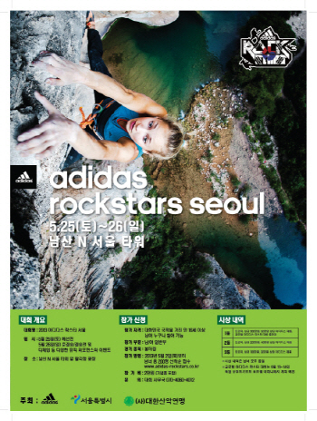 먼저 아디다스 아웃도어는 오는 25~26일 서울 남산 N서울 타워 팔각정 광장에서 ‘2013 아디다스 락스타 서울(2013 adidas RockstarsSeoul)’ 볼더링 대회를 개최한다.
