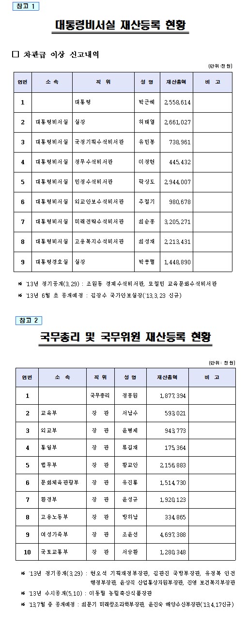 박근혜 정부의 초대 국무위원과 청와대 차관급 이상의 평균 재산은 2008년 4월 이명박 정부 취임 초기의 청와대 대통령실 차관급 이상 35억5652만원, 국무위원 32억5327만원의 절반 수준이다.