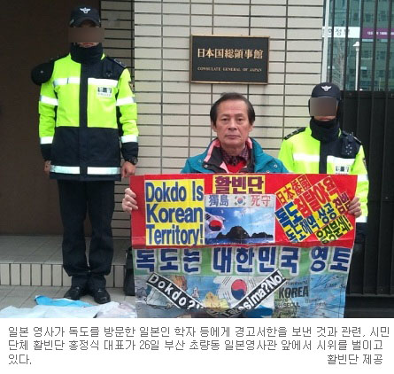 이와 관련, 시민단체 활빈단은 이날 부산 초량동 일본총영사관을 찾아 영사의 경고서한 행위를 강력히 규탄했다. 이들은 “자국 내에서 확산되고 있는 ‘독도는 한국 영토’ 라는 인식을 덮으려는 치졸한 술책”이라고 비난했다.