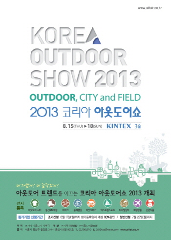 [쿠키 생활] ‘2013 코리아 아웃도어쇼(Korea Outdoor Show 2013)’가 8월 15~18일까지 일산 킨텍스 1전시장에서 열린다. ‘Outdoor, City and Field’라는 슬로건으로 진행되는 이번 코리아 아웃도어쇼에서는 일상까지 스며든 아웃도어의 최신 트렌드를 한 눈에 살펴볼 수 있다.