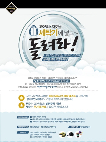 한편 고어코리아에서는 다음달 21일까지 올바른 고어텍스 세탁 및 발수법 이벤트를 진행한다. 이벤트 페이지를 스크랩을 하거나 세탁 혹은 세탁 후 발수처리 인증샷 찍어 SNS에 올린 후 해당 URL을 고어텍스 공식 커뮤니티에 올리면 된다.
