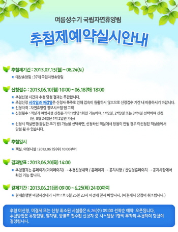 여름 성수기 기간은 7월 15일부터 8월 24일까지로, 1인당 1회에 한해서 전국 37개 국립자연휴양림 객실과 야영시설을 1박2일, 2박3일 또는 3박4일 선택해서 신청할 수 있다. 예약은 선착순이 아니기 때문에 기간 내에만 접수하면 무작위로 추첨해 다음달 20일 홈페이지에 발표한다.