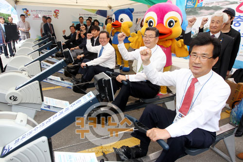 (사진=이시종 충북지사(앞), 이기용 충북도교육감(두 번째), 이종배 충주시장(가운데)이 29일 충북도청 광장에서 조정 체험기구인 에르고미터를 이용해 조정경기를 하고 있다.)