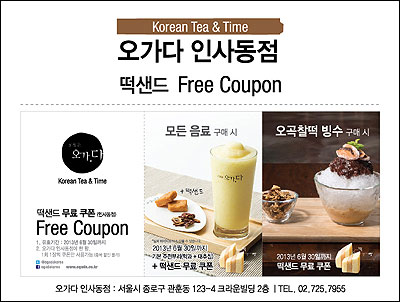Free 쿠폰은 매장에서 모든 음료 구매 시 기본 주전부리(약과+무설탕 국산대추칩)와 떡샌드를 제공하는 쿠폰과 오가다의 빙수 메뉴인 오곡찰떡빙수, 오미자빙수, 수정과빙수 주문 시 떡샌드를 무료로 증정하는 쿠폰 등 2개로 구성돼 있다.