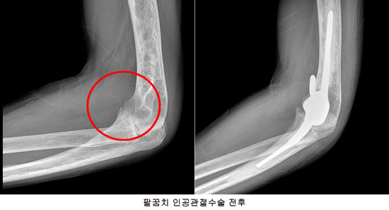[쿠키 건강] #경기도 안양시 동안구에 거주하는 64세 고모씨는 최근 왼쪽 팔꿈치에 바늘로 팔을 찌르는 듯한 통증에 밤잠까지 설쳤다. 또 팔을 10~80도밖에 움직일 수 없었고, 팔 전체가 차갑고 시려 머리를 감거나 양손으로 세수하는 등의 일상생활에 어려움을 겪었다. 검사결과 관절손상 정도가 심해 이미 기능을 거의 상실한 상태였고, 모양 변형도 심해 팔꿈치 인공관절치환술이 최선의 선택이라는 진단을 받았다.