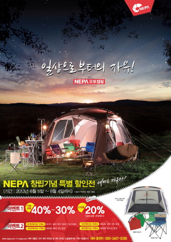 네파의 ‘오토캠핑 특별 기획전’은 창립을 기념해 그간의 고객 사랑에 보답하기 위해 마련됐다. 이번 행사를 통해 오토캠핑 이월상품을 30%부터 최대 40%까지 할인된 가격에 제공하며, 2013년 신상품 도 20% 할인된 가격에 판매한다.