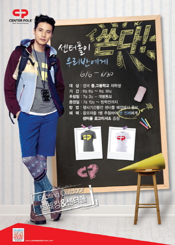 ‘센터폴이 우리반에게 쏜다!’ 이벤트는 전국 중·고등학교 여름방학이 시작하기 전 반 친구들과의 재미있는 추억을 남길 수 있는 반 단체 티셔츠 신청하기 이벤트다. 전국 센터폴 매장에서 중·고등학교 재학생이면 누구나 참여할 수 있으며, 매장에 비치된 응모쿠폰을 작성해 응모함에 넣으면 된다.
