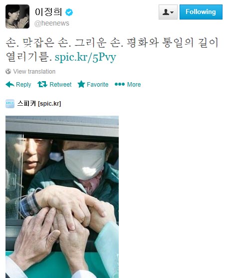 이 대표는 6일 오후 자신의 트위터에 남북 이산가족이 헤어지면서 손을 맞잡은 한 인터넷 언론의 사진을 올리고 “손. 맞잡은 손. 그리운 손. 평화와 통일의 길이 열리기를.”라고 적었다.