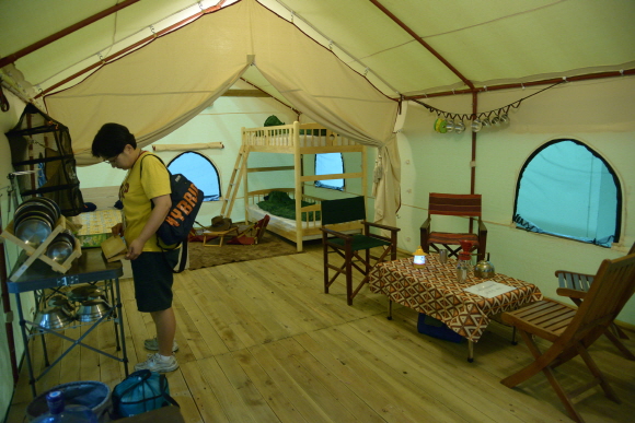 캠프리카는 최근 유행인 글램핑 하우스를 선보였다. 호텔 수준의 글램핑 사이트로, 내부에 더블베드와 이층 침대를 갖춘 침실공간과 원목 테이블과 릴렉스 체어를 둔 거실공간, 조리를 할 수 있는 주방공간까지 마련되어 있다.