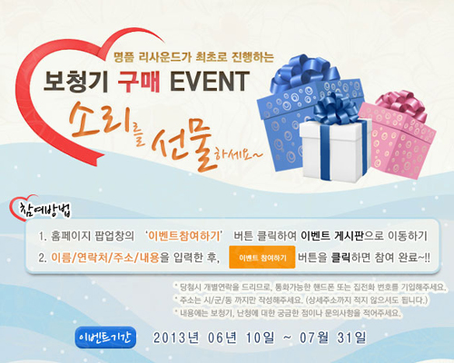 이번 이벤트는 리사운드보청기 홈페이지(www.resoundkorea.com)에서 누구나 참여가 가능하며, 선착순 구매고객 100명에게 보청기 구매시 다양한 선물 등 추가 혜택이 제공된다.