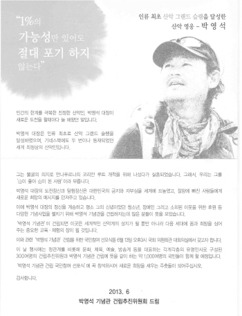 [쿠키 생활] 박영석 기념관 건립을 위한 국민참여 선포식이 오는 13일 오후 3시 국회 의원회관 대회의실에서 열린다.