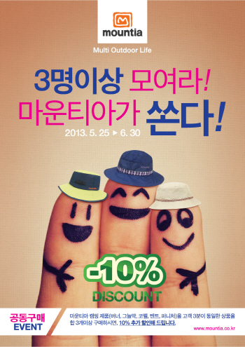 마운티아는 캠핑 신제품 출시를 기념해 텐트, 코펠 등 캠핑 관련 동일 제품을 3개 이상 구매 시 추가 10% 할인 혜택을 제공한다. 텐트 구입 시에는 이너텐트에 함께 사용 할 수 있는 매트와 전국 캠핑장 가이드북을 선착순으로 증정하고 있다.