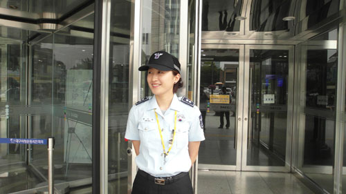 (사진설명=대구시청 여성 청원경찰 정지현씨가 13일 대구시청 정문을 지키고 있다.