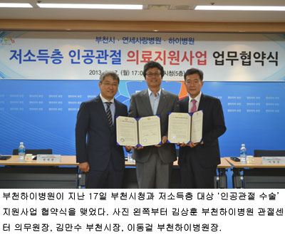 이동걸 부천하이병원 병원장은 “관절이 거의 마모돼 기능이 상실된 환자에겐 ‘인공관절수술’ 밖에 답이 없다. 하지만 개인이 부담해야 할 금액이 저소득 가정에겐 많은 부담이 될 수밖에 없다”며 “결국 민간의 공공의료 참여가 절실한 상황에서 사회적 병원으로서의 역할을 다하기 위해 이번 협약을 맺게 됐다”고 밝혔다.