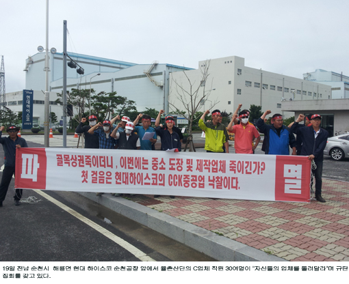이 업체 근로자 30여명은 19일 오후 전남 순천시 해룡면 현대 하이스코 순천공장 앞에서 “현대 하이스코에 상생을 원한다, 말로 하는 지역사랑 행동으로 실천하라”며 현대 하이스코에 대한 규탄 대회를 가졌다.