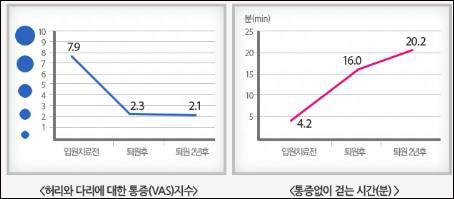 이번에 발표된 연구 결과에 따르면 꾸준한 치료와 관리를 통해 환자가 느끼는 허리와 다리 통증에 대한 통증지수(VAS지수)가 퇴원할 때 2.3에서 퇴원 2년 후 2.1로 줄어들었고 통증 없이 걷는 시간은 입원 시 4.2분에서 퇴원 시 16분, 퇴원 2년 후에는 5배 정도 증가한 20분으로 추가적으로 더 늘어났다.
