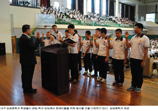 대구 성광중학교는 26일 ‘국제장애인문화교류 대구광역시협회(정덕주 회장)’와 협약을 맺고 ‘성광중학교 봉사단’ 발대식을 열었다.