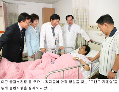 이근 총괄부원장과 양승현 행정원장, 김주현 진료부원장, 박효선 간호부장 등 주요 보직자들은 매주 금요일 오전 7시30분 병실환자들을 방문해 불편사항을 듣고 적극적으로 해결에 나서고 있다.