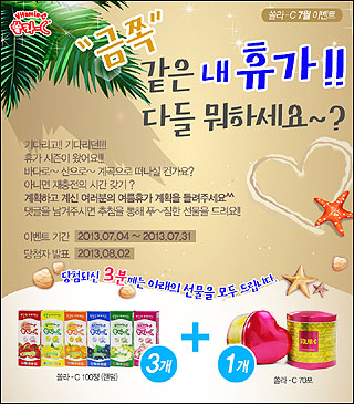 이벤트에 참여하려면 쏠라씨 홈페이지(www.solar-c.com)에 접속, 기발하고 특별한 나만의 여름휴가 계획을 댓글로 남기면 된다. 응모자 중 추첨을 통해 3명에게 6가지 맛 중 3가지 맛의 쏠라씨 100정와 쏠라씨 과립 70포로 구성된 쏠라씨 세트를 선물로 증정한다.