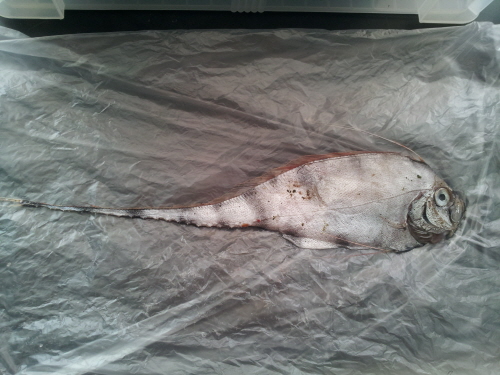 국립수산과학원 남서해수산연구소는 여수 인근의 백야도에서 낚시를 즐기던 중 바위틈에서 발견했다는 제보자의 어류를 확인한 결과 산갈치와 비슷하게 생긴 ‘홍투라치’ 인 것으로 확인됐다고 16일 밝혔다.