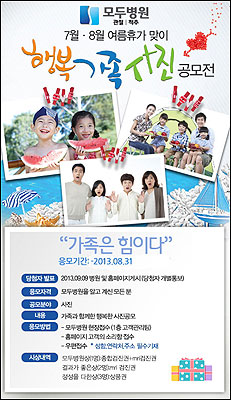 이번 가족사진 공모전은 7, 8월 여름휴가철을 맞아 가족이 함께한 행복한 사진을 찍어 인천모두병원을 직접 방문해 1층 고객관리팀에게 접수하거나, 병원 홈페이지(www.moduhosp.co.kr) 고객의 소리함에 사진을 올리거나 우편으로 접수하면 된다.