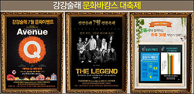강강술래는 이달 31일까지 홈페이지(www.sullai.com) 고객마당(이벤트참여)에 신청글을 올리면 추첨을 통해 음악공연과 뮤지컬 티켓, 민음사 추천도서 등 푸짐한 선물을 증정하는 ‘문화바캉스 대축제’를 벌인다.