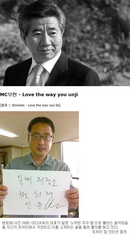 특히 변희재 미디어워치 대표는 일명 ‘노무현 저주 랩’으로 불리는 문제의 음악파일을 자신의 트위터에서 극찬하고 이를 소개하는 글을 올려 논란을 부추기고 있다.