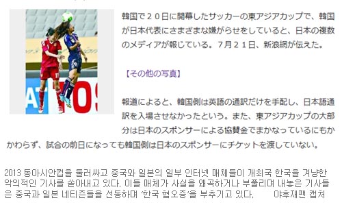 [쿠키 스포츠] 2013 동아시안컵을 둘러싸고 중국와 일본의 일부 인터넷 매체들이 개최국 한국을 겨냥한 악의적인 기사를 쏟아내고 있다. 이들 매체가 사실을 왜곡하거나 부풀리며 내놓은 기사들은 중국과 일본 네티즌들을 선동하며 ‘한국 혐오증’을 부추기고 있다.