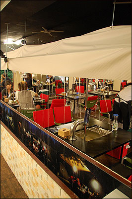 실내형 화로테이블과 함께 특허 출원한 타프레인시스템은 자동롤링 시스템을 통해 천막에서 지속적으로 물이 떨어지는 획기적인 기술이다. 이 시스템은 테이블 옆 수로에 떨어져 고인 물이 천막 안으로 자동 순환돼 다시 천막을 통해 흐르는 구조다. 특이한 것은 이 과정에서 천막이 전혀 젖지 않으며 고객들 자리로 물이 튀지 않는다는 점.