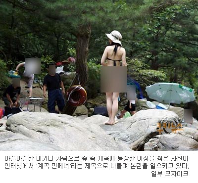 경찰 관계자는 “계곡에서 비키니 수영복을 입었다고 처벌할 수는 없지만 도의적·사회적으로는 비판을 받기 충분한 사진”이라며 “사진을 찍어 공개 게시판에 올리면서 다른 사람들의 얼굴이 그대로 드러나도록 한 경우에는 법적 처벌의 대상이 될 수 있다”고 말했다.