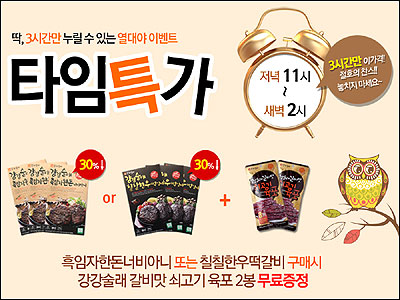행사기간 동안 저녁 11시부터 새벽 2시까지 온라인쇼핑몰(www.sullaimall.com)에서 100% 한우갈비살만을 사용한 ‘칠칠한우떡갈비’(3세트/4만2000원)와 흑임자와 국내산 돼지고기가 70%나 함유된 ‘흑임자한돈너비아니’(3세트/2만5200원)를 구매하면 30% 할인 혜택과 함께 갈비맛 쇠고기육포 2봉(1만2000원)을 덤으로 준다.
