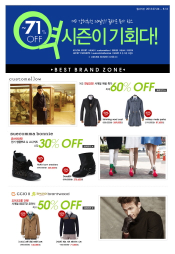 코오롱FnC가 전개하는 브랜드의 제품들을 만날 수 있는 조이코오롱(www.joykolon.com)은 8월 12일까지 ‘계절파괴 상품전’을 마련했다. 커스텀멜로우, 쿠론, 럭키슈에뜨는 물론 코오롱스포츠, 헤드의 사계절 상품을 최대 70%까지 저렴한 가격에 구입할 수 있다.