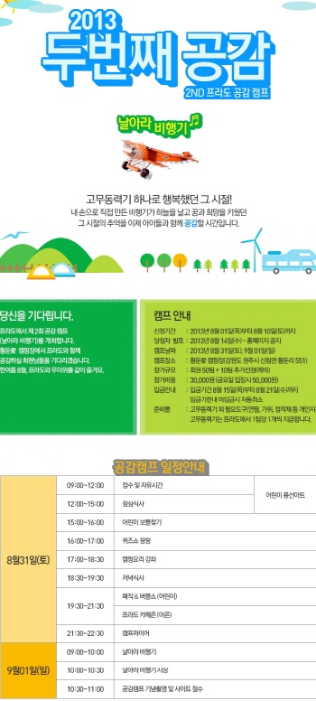 2회 공감캠프는 ‘추억의 공감’이란 부제로 아빠와 아이들이 함께 만들어 날리는 고무동력기 대회, 어린이 보물찾기, 캠핑요리강좌, 그리고 저녁에는 어린이와 함께하는 공감매직쇼를 비롯해 캠프파이어까지 알찬 프로그램을 준비했다.
