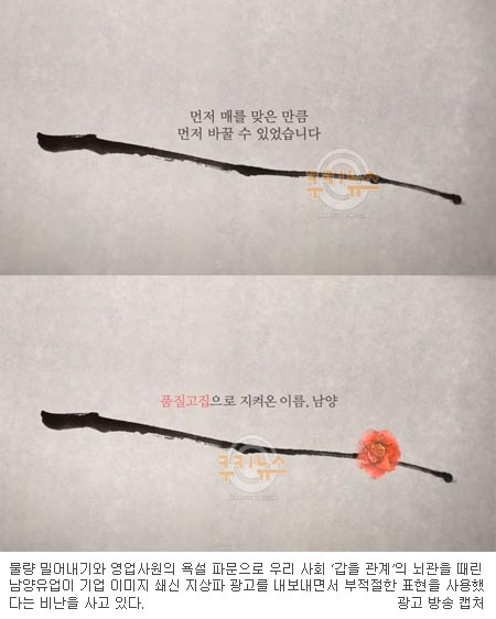[쿠키 사회] 물량 밀어내기와 영업사원의 욕설 파문으로 우리 사회 ‘갑을 관계’의 뇌관을 때린 남양유업이 기업 이미지 쇄신 지상파 광고를 내보내면서 부적절한 표현을 사용했다는 비난을 사고 있다. 네티즌들은 “사과 광고를 하면서도 제대로 자신의 잘못을 인정하지 않는다”며 혀를 차고 있다.