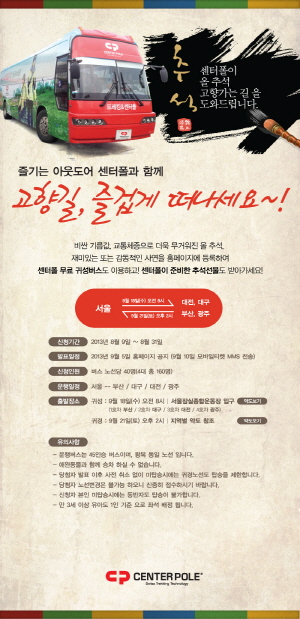 윤재익 총괄이사는 “다가오는 추석 명절을 맞아 센터폴을 사랑해주신 고객에게 감사의 마음을 전하고 색다른 서비스와 편의를 제공하기 위해 귀성길 무료 버스를 준비했다”고 전했다.