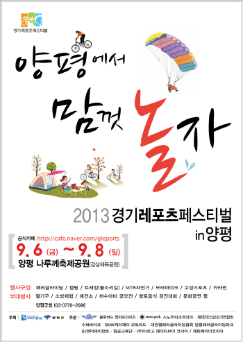 [쿠키 생화] 다음달 6일부터 8일까지 2박 3일간 경기도 양평군 나루께 축제공원에서 ‘2013 경기레포츠페스티벌’이 개최된다. 경기레포츠페스티벌은 캠핑은 물론 다양한 레포츠를 함께 즐길 수 있는 국내 최대의 종합레포츠 축제다.