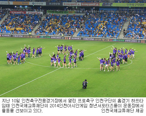 [쿠키 스포츠] 인천국제교류재단은 프로축구 인천유나이티드와 FC서울의 경기가 열렸던 지난 10일 인천 축구 전용경기장에서 2014 인천아시아경기대회 청년서포터즈가 색다른 응원 퍼포먼스를 선보였다고 11일 밝혔다.