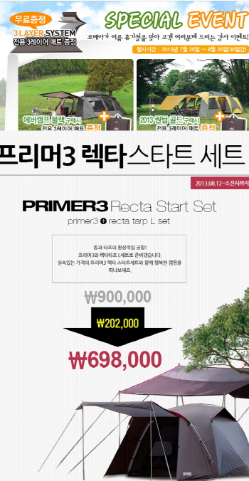 올해 론칭한 프라도는 모델 송일국을 앞세워 가을까지 파상공세를 이어간다. 올해 가장 많이 판매된 텐트 프리머3와 렉타타프를 조합한 스타트세트를 출시했다. 낱개 구매할 때보다 20만원가량 저렴하다.