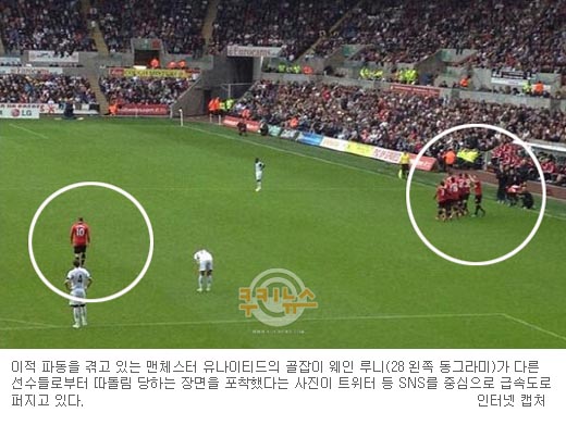 [쿠키 스포츠] 이적 파동을 겪고 있는 맨체스터 유나이티드(이하 맨유)의 골잡이 웨인 루니(28)가 다른 선수들로부터 따돌림 당하는 장면을 포착했다는 사진이 트위터 등 SNS를 중심으로 급속도로 퍼지고 있다. 일명 ‘루니 왕따 사진’을 접한 축구팬들은 “맨유의 상징이자 EPL의 대표 골잡이가 어쩌다 저리 됐나”며 안타까워하고 있다.