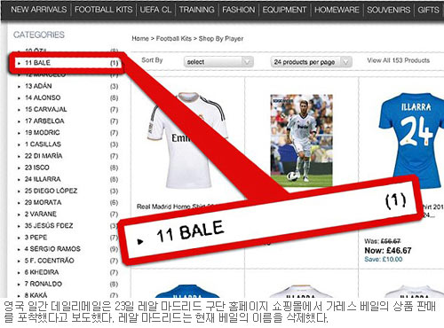이로 인해 세계 축구팬들이 몰리면서 구단 홈페이지 쇼핑몰은 한때 정상적으로 작동하지 않았다. 서비스가 재개된 23일 오전 8시 현재 쇼핑몰의 선수별 항목에는 베일의 이름이 삭제된 상태다. 이 쇼핑몰의 운영사인 아디다스는 “하청업체의 실수”라고 해명했다.