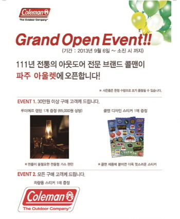 이번 행사는 신규 매장 오픈일부터 사은품 소진 시까지 진행된다. 행사 관련 자세한 사항은 콜맨 홈페이지를 통해 확인할 수 있다.