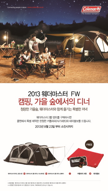 [쿠키 생활] 캠핑 브랜드 콜맨이 웨더마스터 2룸 텐트를 구입하면 한정판 사은품을 증정하는 ‘캠핑, 가을 숲에서의 디너’ 이벤트를 실시한다.