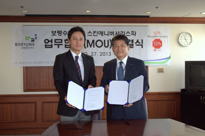 [쿠키 건강] 보령수앤수가 27일 보령빌딩에서 스킨애니버셔리스파와 공동개발 및 업무협력을 위한 협약식(MOU)을 맺고, 이미용 제품라인 강화에 나선다.