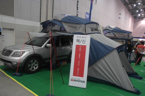 [쿠키 생활] 국내에서 개발 생산하는 루프탑 텐트 ‘아이캠퍼’. 지붕이 유려한 곡선으로 디자인해 기존의 루프탑 텐트 루프에 빗물이 고이는 현상을 없앴다. 루프에 우레탄창을 달아 누워서 하늘을 볼 수 있는 것도 특징이다.