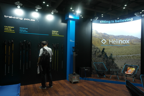 [쿠키 생활] 동아알루미늄은 자사 브랜드 헬리녹스 부스를 열어 다양한 트레킹 폴과 트레킹 체어를 전시했다.
