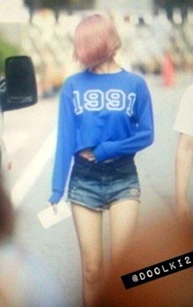 선미는 파란색 크롭톱 티셔츠에 핫팬츠를 입고 날씬한 복부와 다리 라인을 강조하고 있다.
