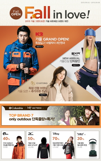 아웃도어스에서는 2013 가을 그랜드 오픈으로 브랜드별 현재 인기판매 순에 따라 등산부문 ‘K2’, 스포츠부문 ‘EXR’, 골프부문 ‘CASTING’이 대표 브랜드로 꼽혔다. 이 외에 NEPA, mizuno, Disney Golf, BFL Outdoor(버팔로 아웃도어) 브랜드들을 중심으로 가을 신상품 최대 40% 할인 및 이월상품에 대해 최대 70% 할인된 금액으로 판매한다. 급격해진 일교차에 대비한 바람막이 제품 혹은 가벼운 아우터 같은 상품이 대다수이며 한정수량의 작년 인기 아이템 위주로 제품이 구성돼 오는 8일까지 진행한다.