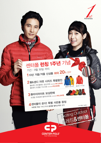 센터폴은 9월 한 달 동안 2013년 가을겨울 신상품을 최대 20%까지 할인된 가격에 판매한다. 또한 가을 기획상품으로 센터폴의 ‘폴&샌디’ 남녀 방수자켓과 초경량 구스다운을 파격적인 특별할인가로 선보인다.