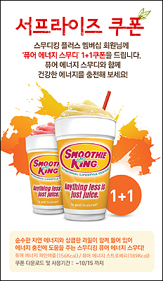 [쿠키 생활] 스무디 브랜드 스무디킹이 신제품 ‘퓨어 에너지 스무디’의 성공적인 출시를 기념하며 고객 감사 행사로 스무디킹 모바일 앱을 통해 ‘퓨어 에너지 스무디’ 1+1 쿠폰을 증정하는 ‘서프라이즈 이벤트’를 진행한다.